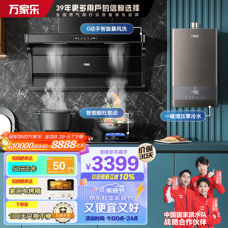 万家乐烟灶热三件套 顶侧双吸油烟机24立方烟灶联动双增压16L零冷水热水器AK6+KV063B+16DL1天然气价格:3599.00元!