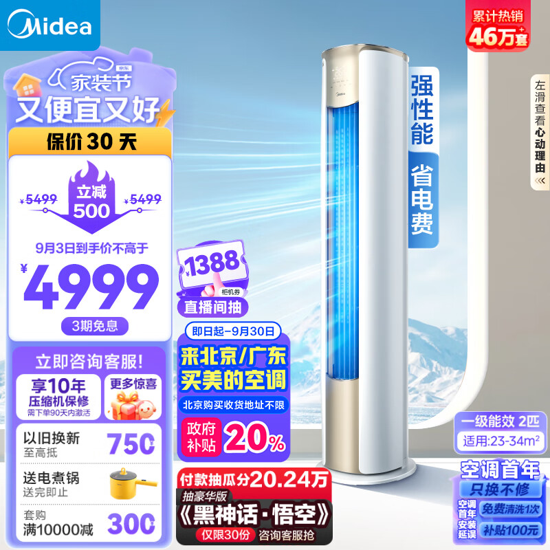 美的(Midea)空调 2匹 锐云2代 新一级能效 变频冷暖 除湿 空调立式 客厅空调柜机KFR-51LW/N8XHA1Ⅱ价格:4999.00元!