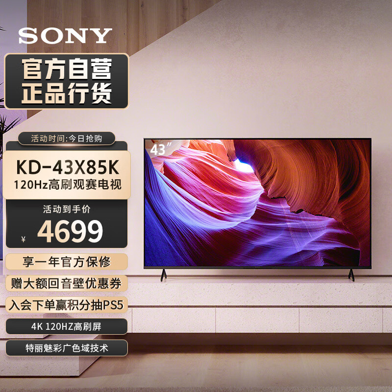 索尼(SONY)【官方直营】KD-43X85K 43英寸 4K HDR 屏智能电视 广色域 120Hz高刷 X1芯片 京配上门价格:4699.00元!