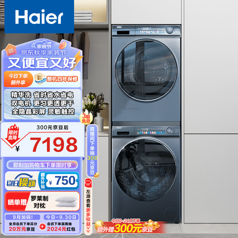 海尔(Haier)SL6精华洗洗烘套装 10KG超薄滚筒洗衣机全自动+双擎热泵烘干机家用 1.1洗净比 SL6+81 以旧换新价格:7498.00元!