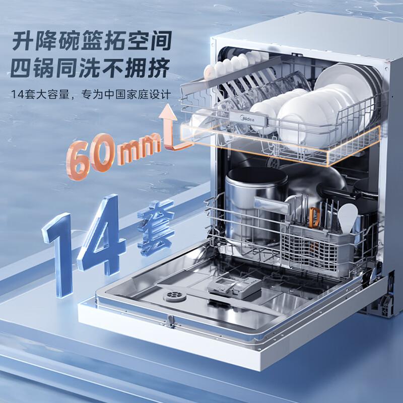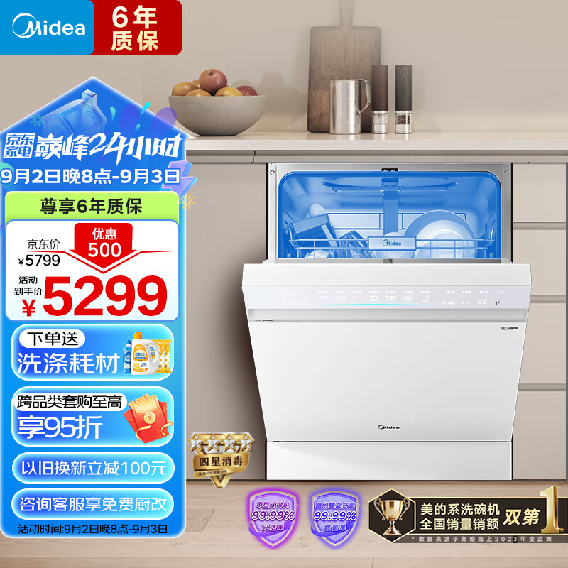 美的(Midea)云朵系列白月光万向洗碗机嵌入式14套大容量105℃热风烘干四星消毒一级水效168h存储变频X6(白)价格:5299.00元!