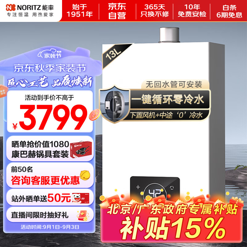 能率(NORITZ)零冷水燃气热水器13升 中途开关“0”冷水 降噪恒温GQ-13E5FEXQ(JSQ25-E5Q)天然气价格:3799.00元!