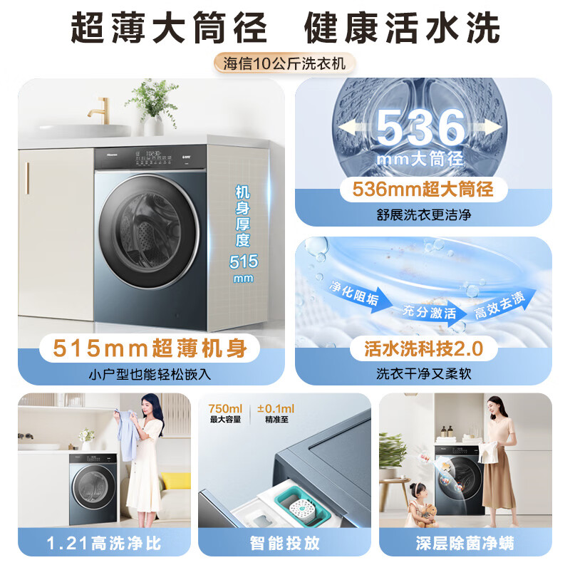 海信滚筒洗衣机全自动10公斤大筒径超薄智能洗 1.21洗净比活水洗2.0 智能投放 以旧换新 钢琴师HG10IE2价格:1999.00元!