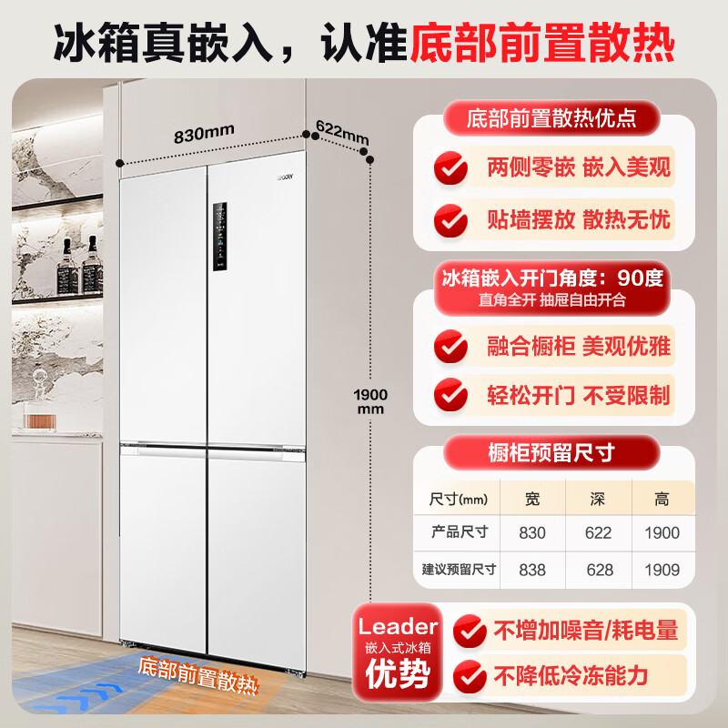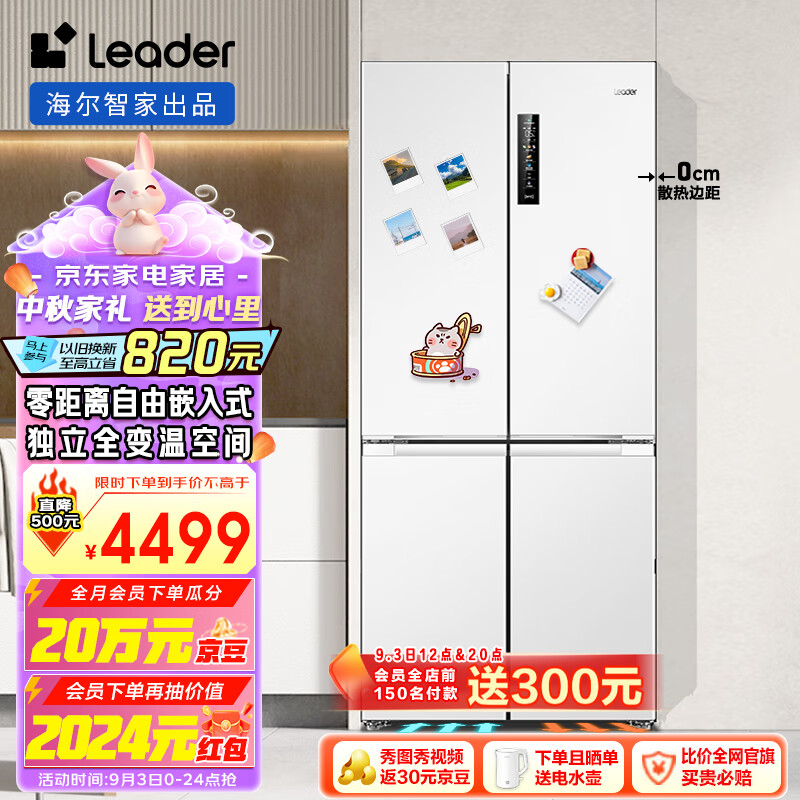 Leader 海尔智家出品502升一级风冷白色四开十字对开门家用以旧换新零嵌入式电冰箱BCD-502WGLTD49W9U1价格:4999.00元!
