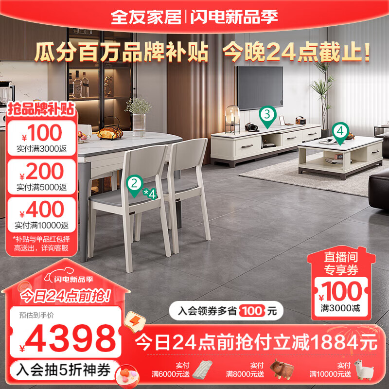 全友家居 现代简约客餐厅家用岩板茶几电视柜一桌四椅组合全套120709价格:6282.86元!