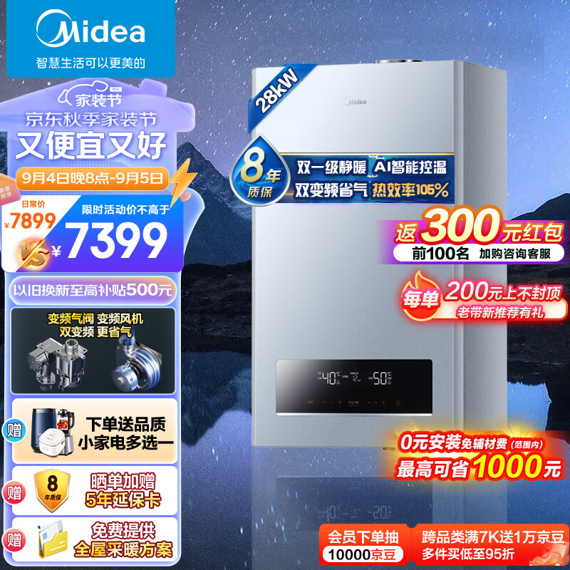 美的(Midea)无极双变频一级能效低噪冷凝燃气壁挂炉天然气采暖地暖锅炉热水器以旧换新免辅材费LL1PBD28-R53价格:7899.00元!