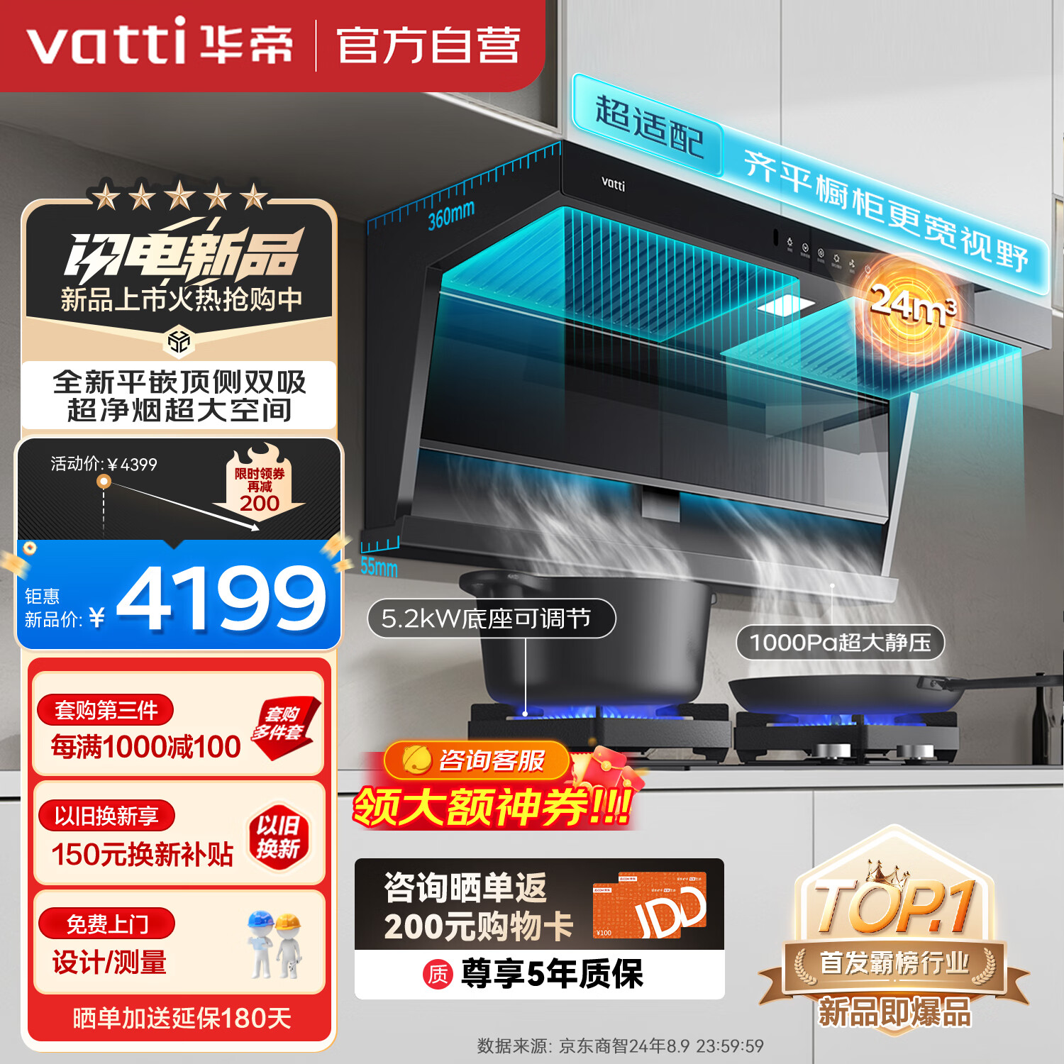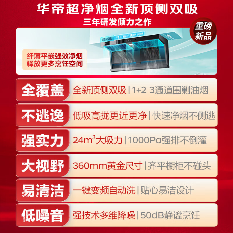 华帝【小飞翼】顶侧双吸24风量脱排抽吸油烟机K6家用大吸力7字型5.2kW定时燃气灶具 i11236烟灶套装价格:4699.00元!