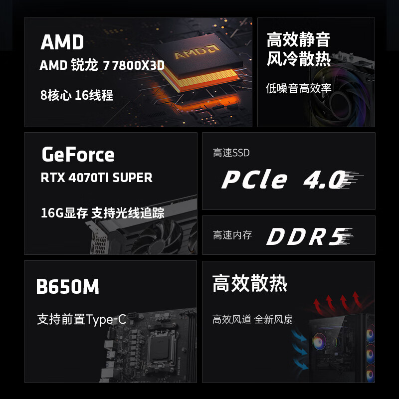 AMD龙神 锐龙R7 7800x3D/RTX4070TISuper 16G/32G/2T黑神话悟空游戏设计台式电脑主机diy组装整机价格:17099.00元!