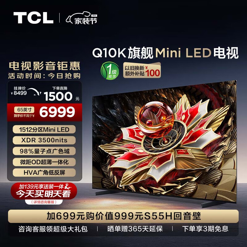 TCL电视 65Q10K 65英寸 Mini LED 1512分区 XDR 3500nits QLED量子点 超薄 北京以旧换新一级能效价格:6999.00元!
