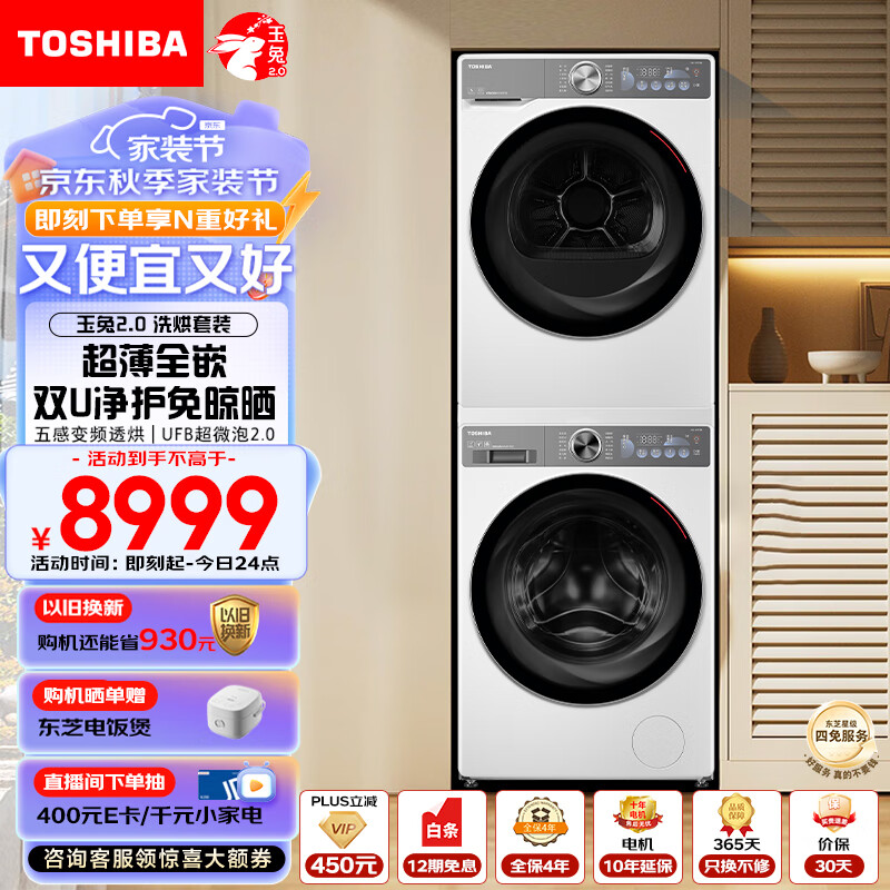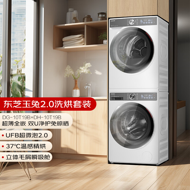 东芝(TOSHIBA)玉兔2.0洗烘套装【DG-10T19B+DH-10T19B】超薄全嵌 10KG滚筒洗衣机+变频热泵烘干机家用 以旧换新价格:8999.00元!