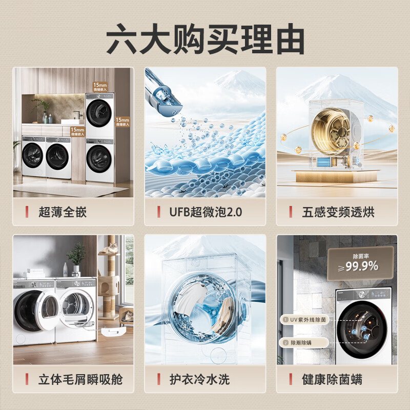 1、颜值很高,设计简洁,功能齐全,两台机器可以同时使用,洗烘两不耽误。还有UFB超微泡技术,杀菌技术,低温烘干,很不错了。推荐。