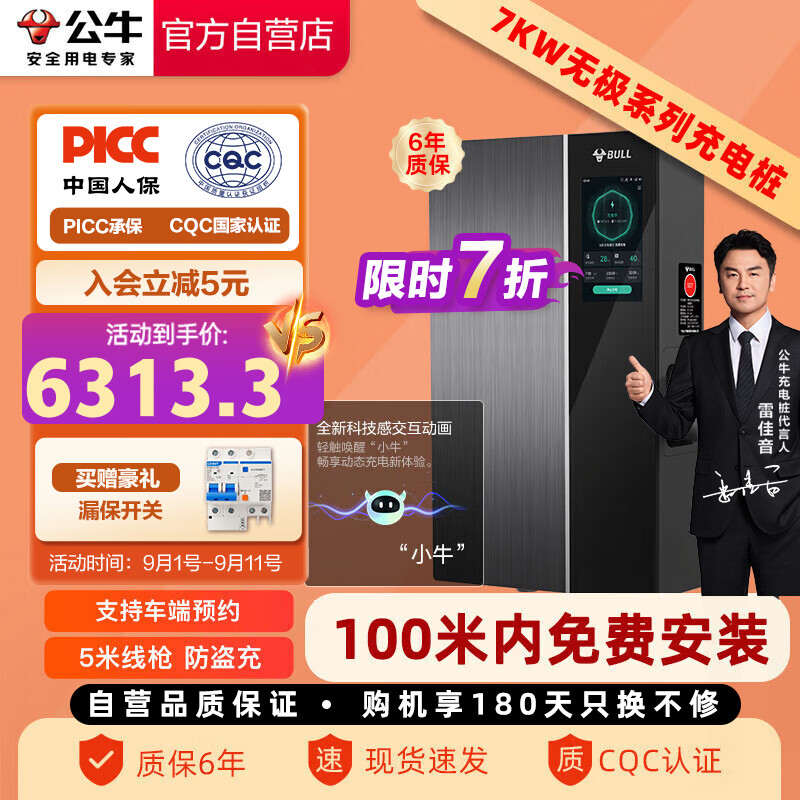 公牛新能源汽车交流充电桩适配于小米su7汽车特斯拉比亚迪问界小鹏理想蔚来 7KW无极款 含100米安装价格:8975.90元!