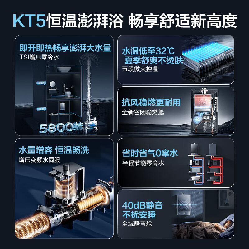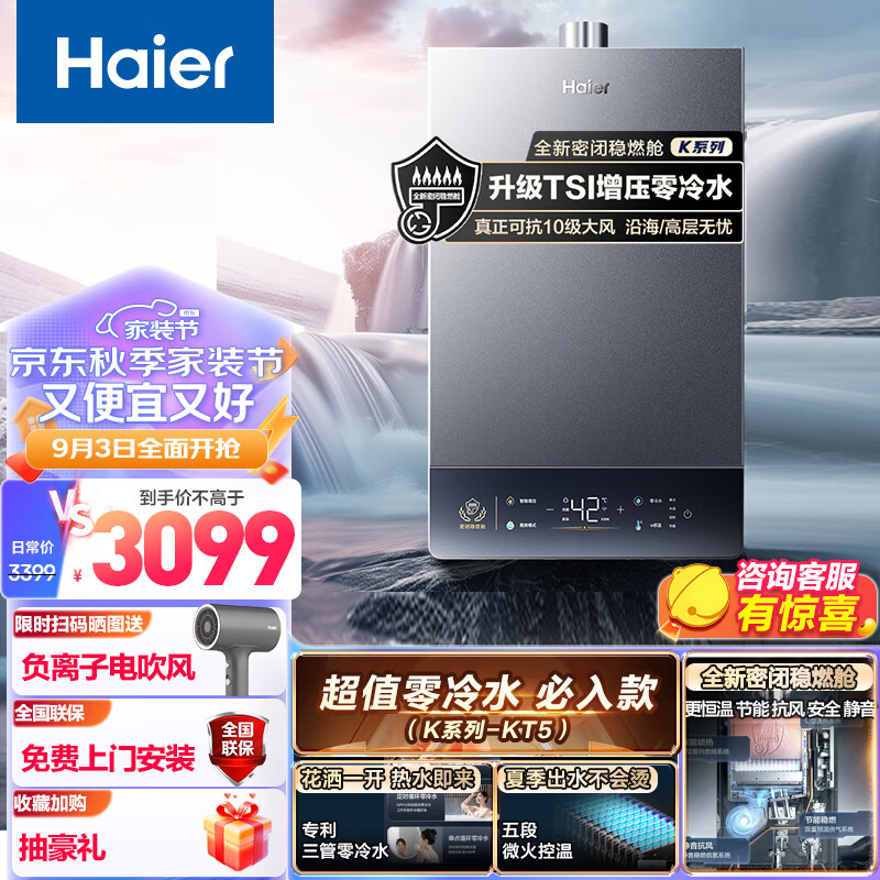 海尔(Haier)16升【K系列KT5】零冷水燃气热水器天然气水伺服恒温 TSI增压 静音JSQ31-16KT5FPRCU1【以旧换新】价格:3399.00元!