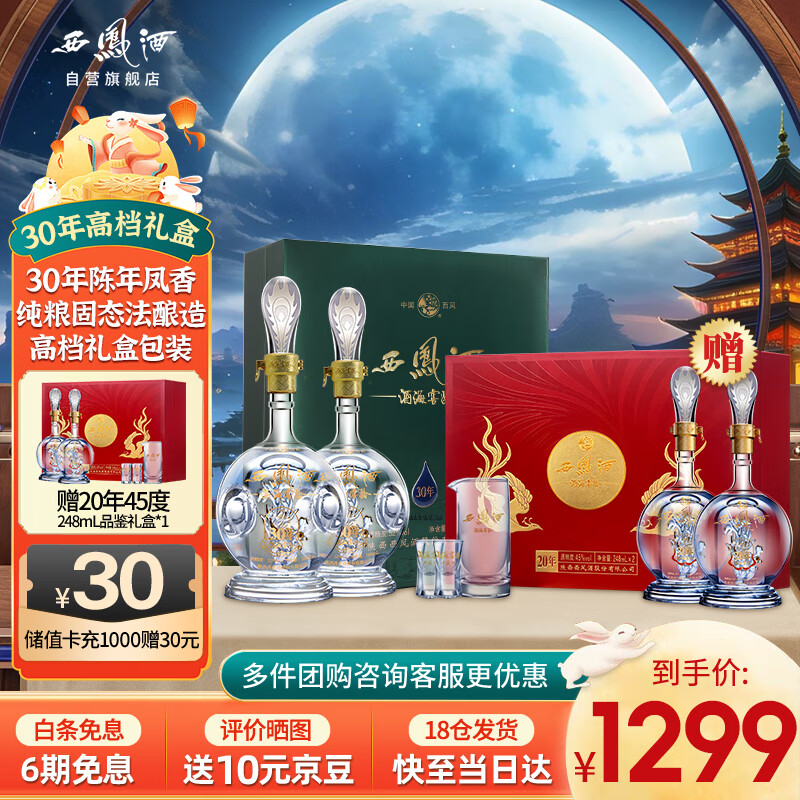 西凤酒 30年52度纯粮陈年凤香型白酒海窖龄中秋节宴请送礼盒装500mL*2价格:1329.00元!