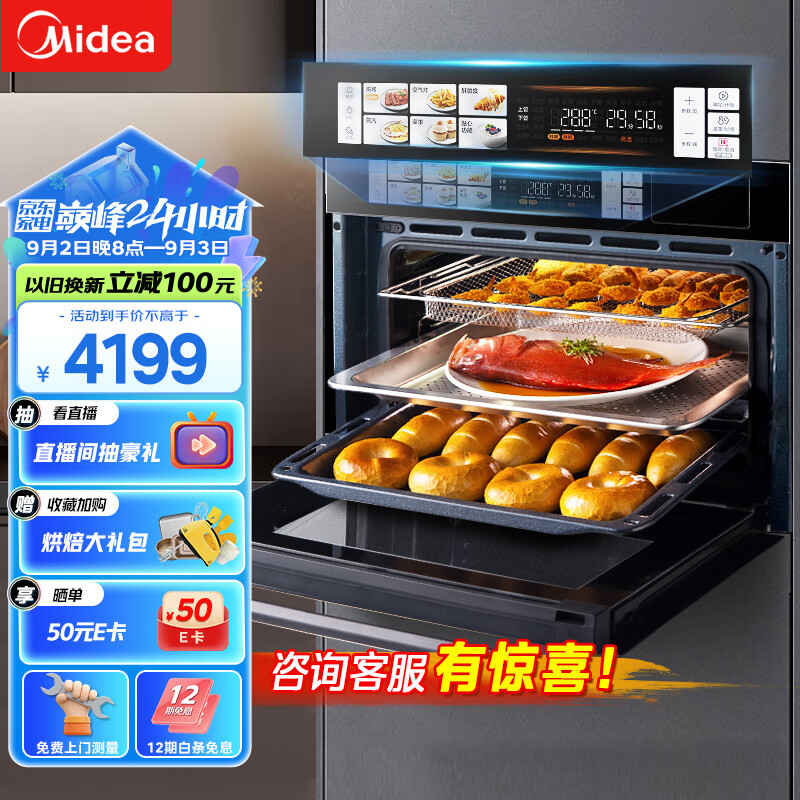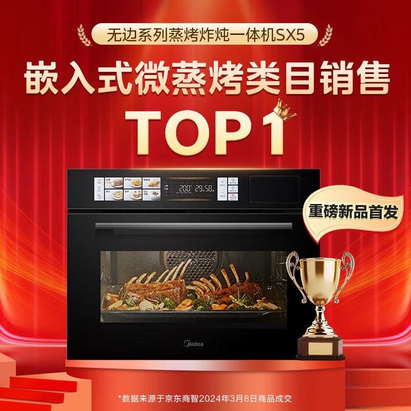 美的无边系列55L嵌入式蒸烤箱一体机 温湿智控 涡轮热风 蒸箱烤箱 蒸烤炸炖4合1体机SX5价格:4199.00元!