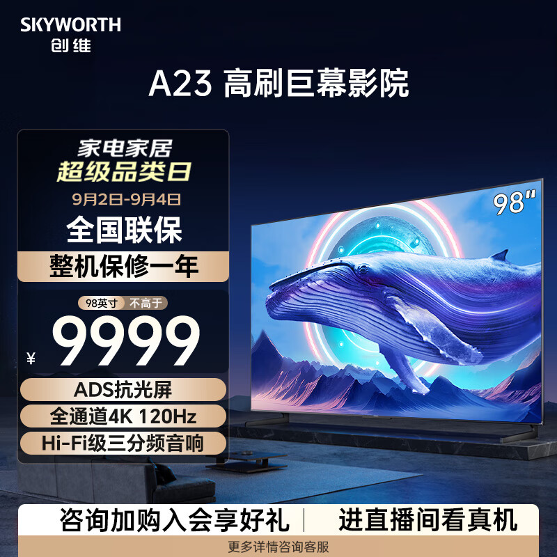 创维电视98A23 98英寸电视机全通道4K 120Hz高刷ADS抗光屏4+64G 4K护眼声控屏100价格:9999.00元!