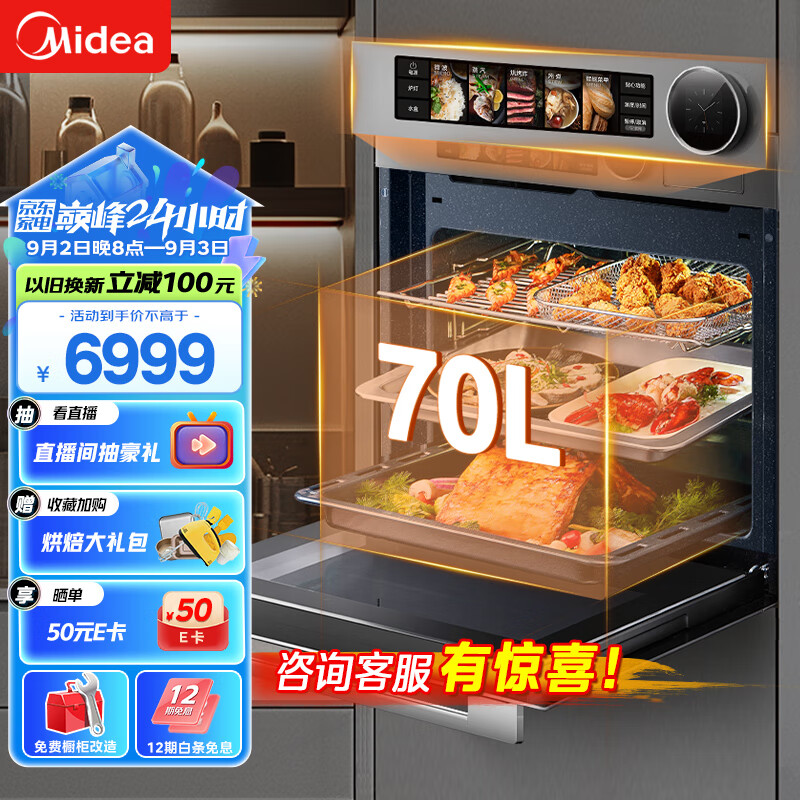 美的无边全嵌70L全变频微蒸烤炸炖5合1体机GR7 嵌入式蒸烤箱一体机 杯水鲜蒸 微蒸烤箱R7价格:6999.00元!