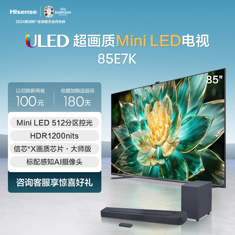 海信电视85E7K+ Bar500沉浸追剧套装 85英寸 ULED X Mini LED AI摄像头超感知智能平板电视机价格:10998.00元!