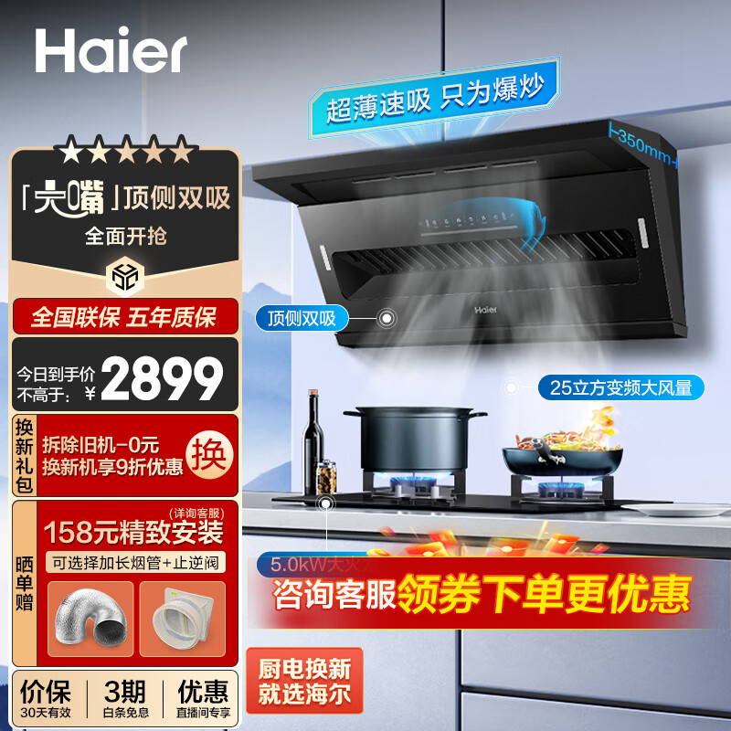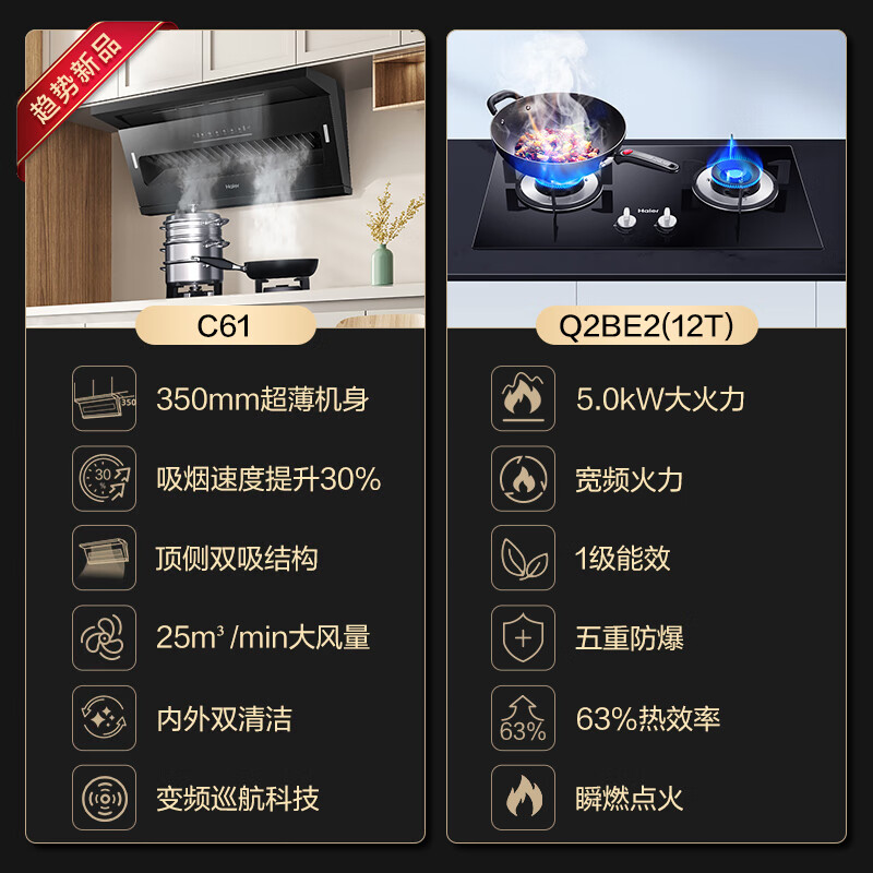 海尔(Haier)抽油烟机 顶侧双吸烟灶套装 变频25m3/min大吸力 5.0kw家用厨房吸油烟机燃气灶具套装C61+Q2BE2天价格:2899.00元!