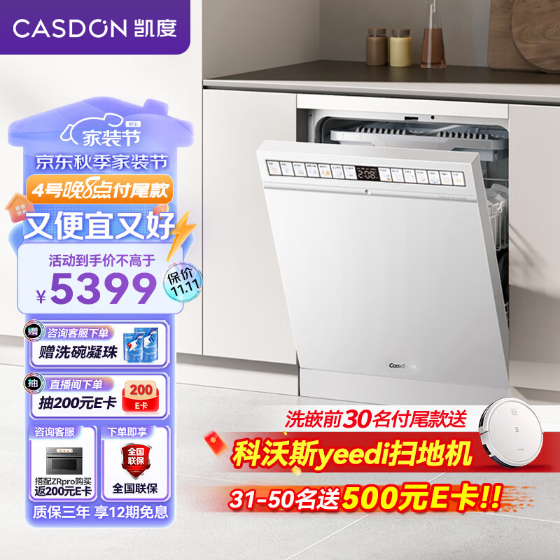 凯度(CASDON)全自动家用烘干独立式 一级水效 智能16套洗碗机嵌入式免费橱改 XWDQ16-T100白色价格:5389.00元!
