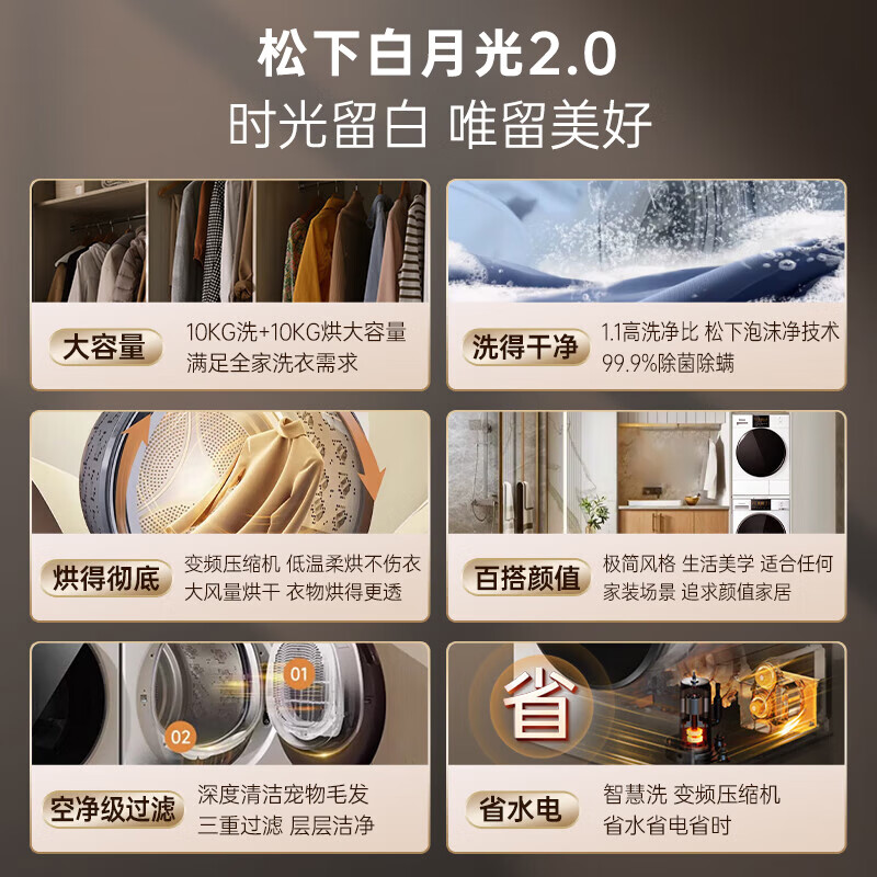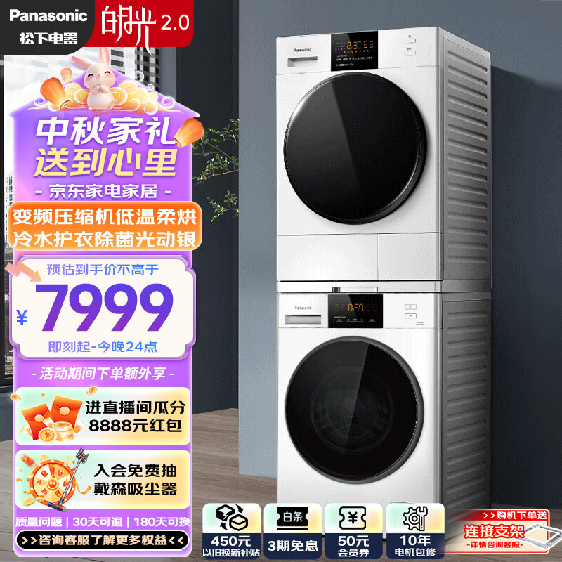 松下(Panasonic)白月光2.0 洗烘套装 10kg滚筒洗衣机+10kg热泵烘干机 变频压缩机 光动银除菌 泡沫净 3E1AK+EH1015价格:12999.00元!