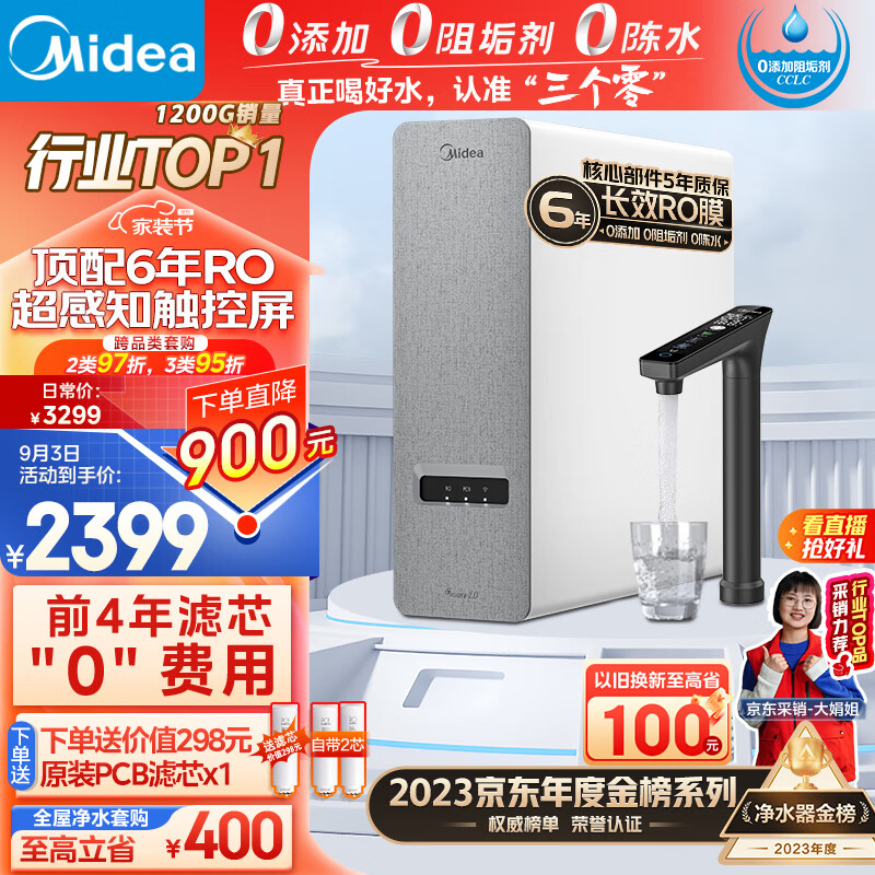 美的(Midea)净水器家用净水机白泽1200G pro 云朵系列 6年RO反渗透厨下式直饮净水器鲜活零陈水双出水3.15L/分价格:2399.00元!