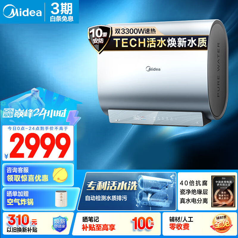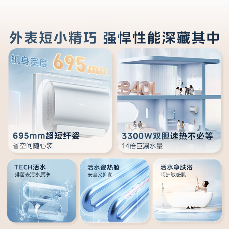 美的(Midea)TECH活水玲珑超薄60升 双胆扁桶电热水器3300W水电分离一级能效F6033-UDpro(HE)京东小家以旧换新价格:3299.00元!
