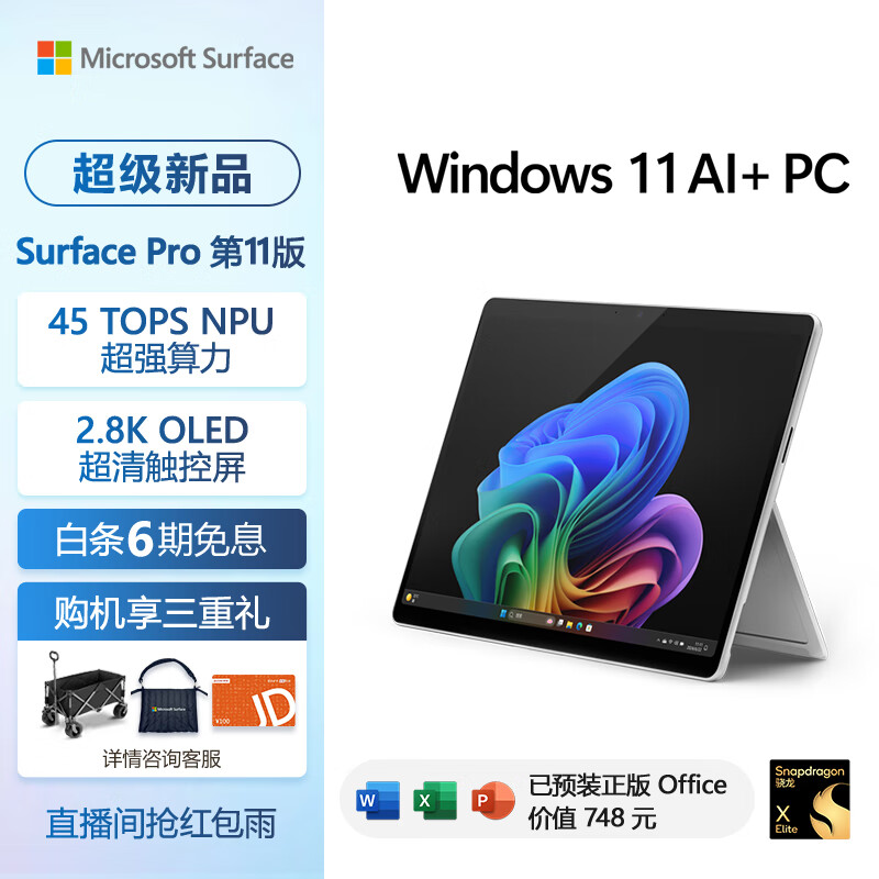 微软(Microsoft)全新Surface Pro第11版 骁龙X Elite 16G 512G 亮铂金二合一平板笔记本电脑 学生平板 AIPC Pro 11价格:11088.00元!