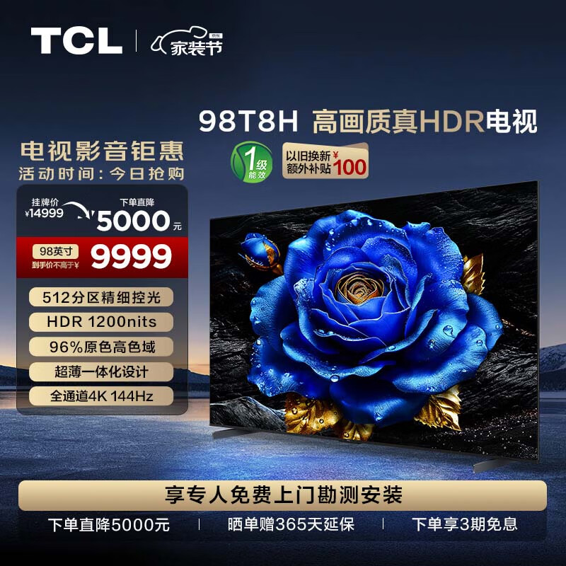 TCL电视 98T8H 98英寸 512分区 HDR1200nits 超薄 2.1声道音响 客厅巨幕电视机 以旧换新一级能效100价格:9999.00元!