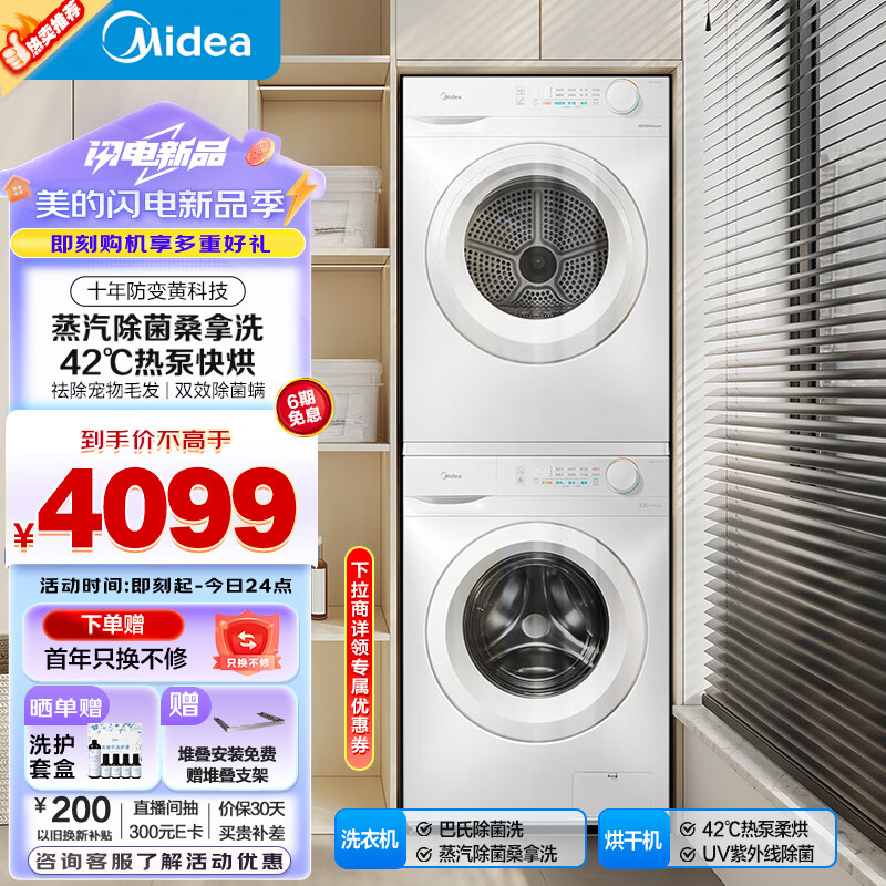 美的(Midea)洗烘套装 10公斤滚筒洗衣机全自动+热泵烘干机 蒸汽除菌 除螨除潮 毛屑过滤MG100V11F+11F价格:4099.00元!