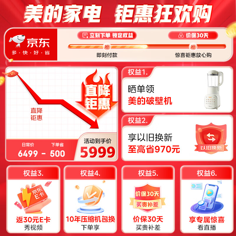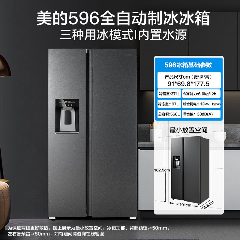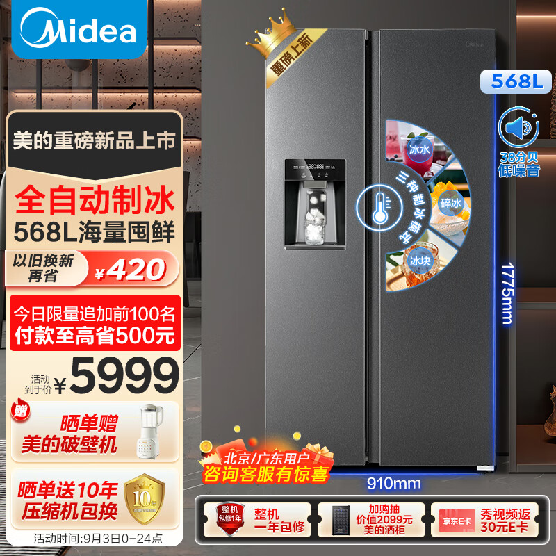 美的(Midea)596自动制冰中型家用电冰箱一级能效节能双开门对开门以旧换新补贴风冷无霜大容量MR-596WKIPZE价格:6999.00元!