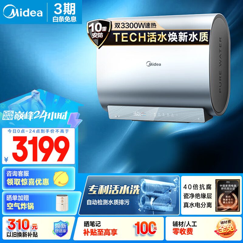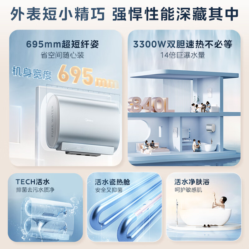 美的(Midea)玲珑超薄80升TECH活水 双胆扁桶电热水器3300W水电分离一级能效F8033-UDpro(HE)京东小家以旧换新价格:3499.00元!