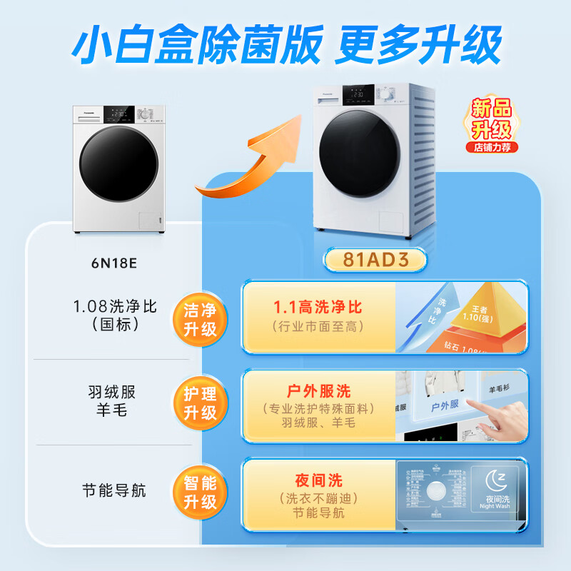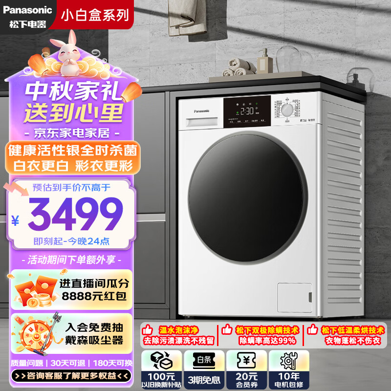 松下(Panasonic)滚筒洗衣机全自动 超薄【小白盒除菌版】10公斤洗烘一体1.1洗净比 夜间洗XQG100-81AD3价格:3499.00元!