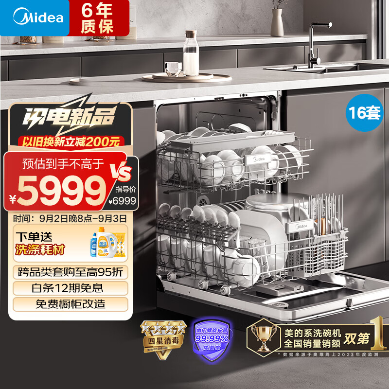美的(Midea)嵌入式洗碗机万向X6Max 16套一级容积率105℃热风烘干四星消毒一键单消毒UV杀菌洗消一体机价格:5999.00元!