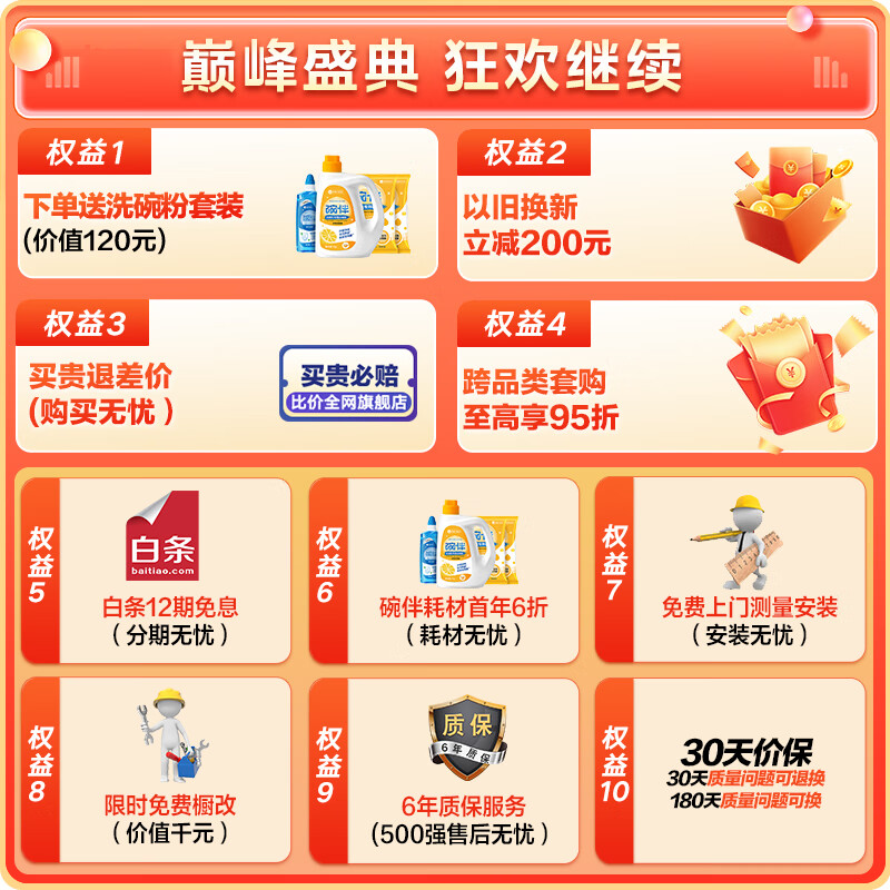 5、大容量洗碗机,而且带单独的消毒功能,省得买消毒柜了,三层喷淋臂,智能产品,用着很方便,模式很多,以后不操心洗碗了??**3000买得值!