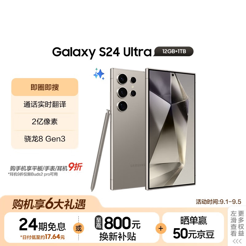 三星(SAMSUNG)Galaxy S24 Ultra AI手机 第三代骁龙8 游戏手机 2亿像素 拍照手机 钛金属边框 12GB+1TB 钛灰价格:12699.00元!