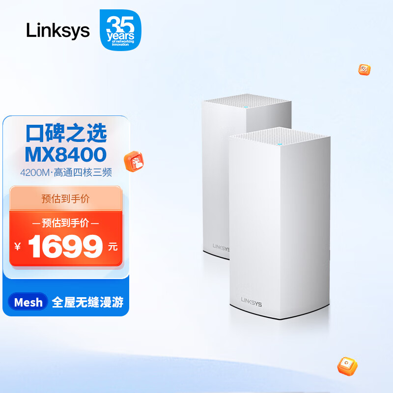 领势(linksys) MX8400路由器穿墙王ax8400千兆WiFi6家用无线路由器三频mesh组网套装【MX4200两支装】价格:1699.00元!