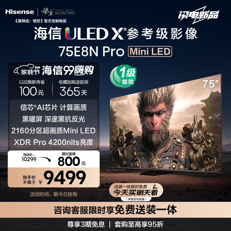 海信电视75E8N Pro 75英寸黑神话悟空游戏 ULED超画质2160分区Mini LED超薄大屏 北京以旧换新一级能效价格:9499.00元!