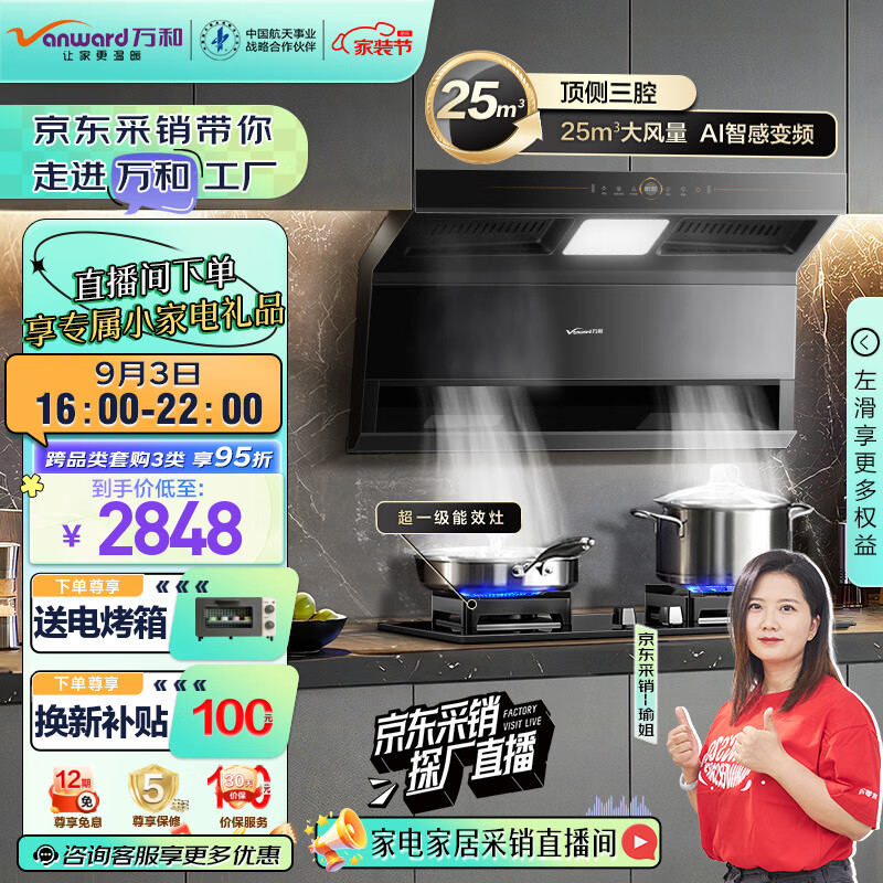 万和(Vanward)顶侧双吸1000Pa三腔直流变频家用抽油烟机 燃气灶具烟灶套装 25m3/min大吸力 WL860+G8L90(天然气)价格:3598.00元!