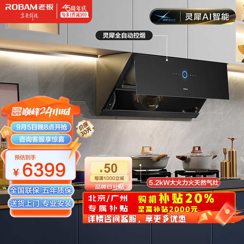 老板(Robam)【灵犀联动】真平嵌侧吸油烟机26风量抽油烟机家用定时防干烧燃气灶具29A9S+51B0A套装(天然气)价格:6399.00元!