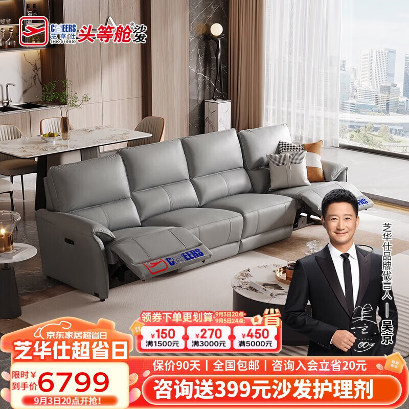 芝华仕(CHEERS)头等舱零靠墙现代简约真皮功能沙发直排轻奢芝华士11323灰四双价格:6799.00元!