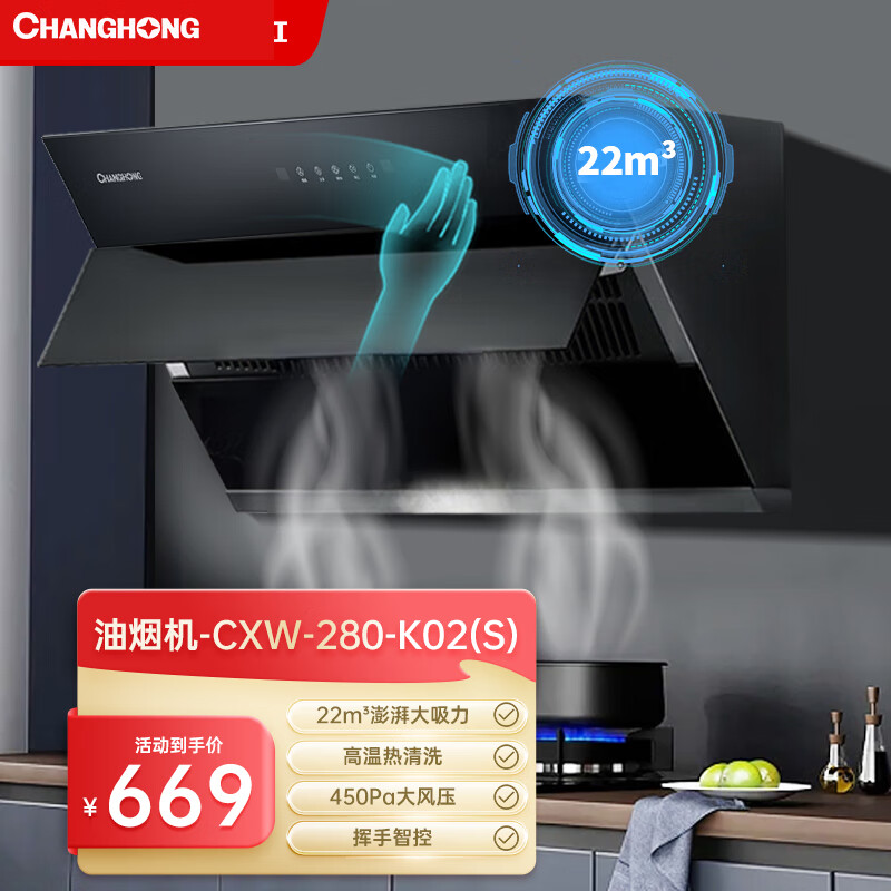 长虹(CHANGHONG)吸油烟机一级能效挥手智控澎湃大吸力高温热清洗自动开合家用抽油烟机CXW-280-K02(S)价格:799.00元!