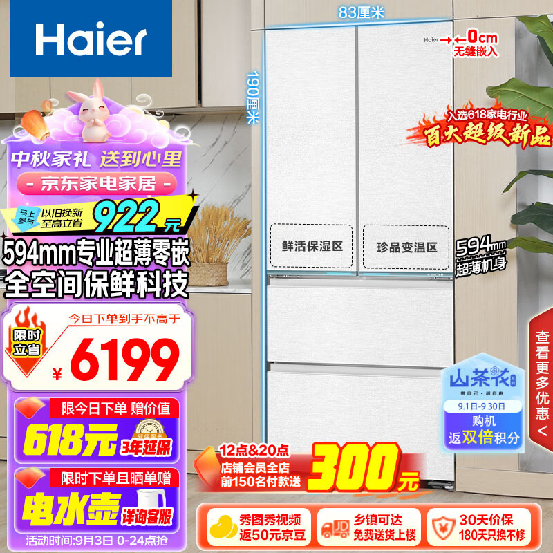 海尔(Haier)【山茶花系列】485升全空间保鲜594mm专业超薄零嵌法式多门家用电冰箱一级能效BCD-485WGHFD1BWLU1价格:6699.00元!