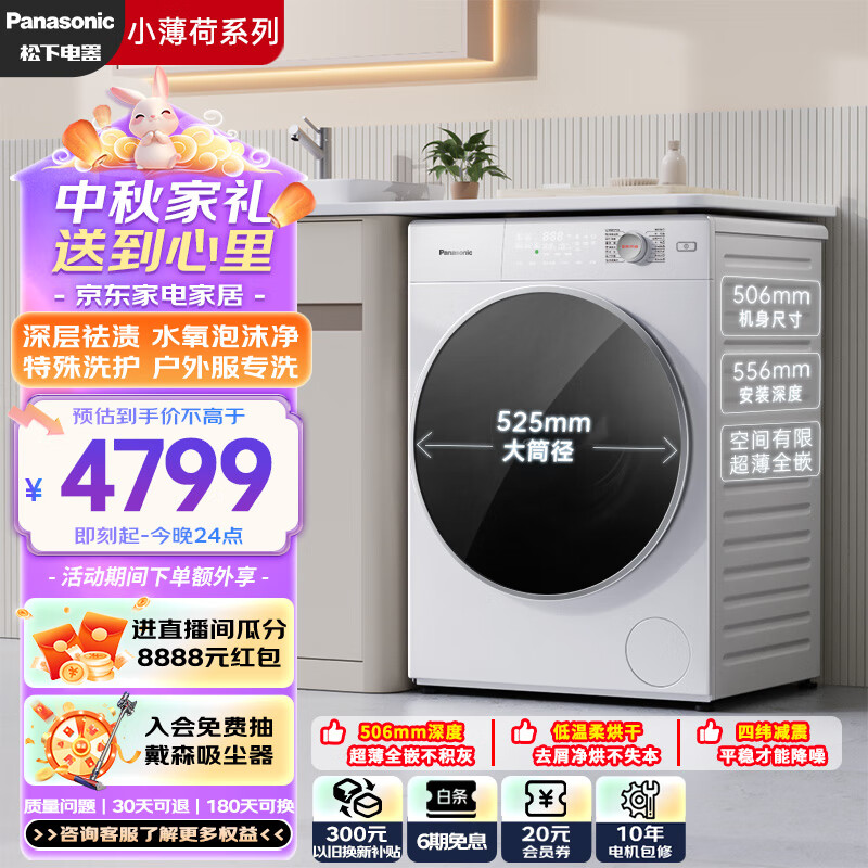 松下(Panasonic)滚筒洗衣机全自动506超薄全嵌【小薄荷SD】10公斤洗烘一体水氧泡沫净 户外服洗悦光白XQG100-SD150价格:4799.00元!