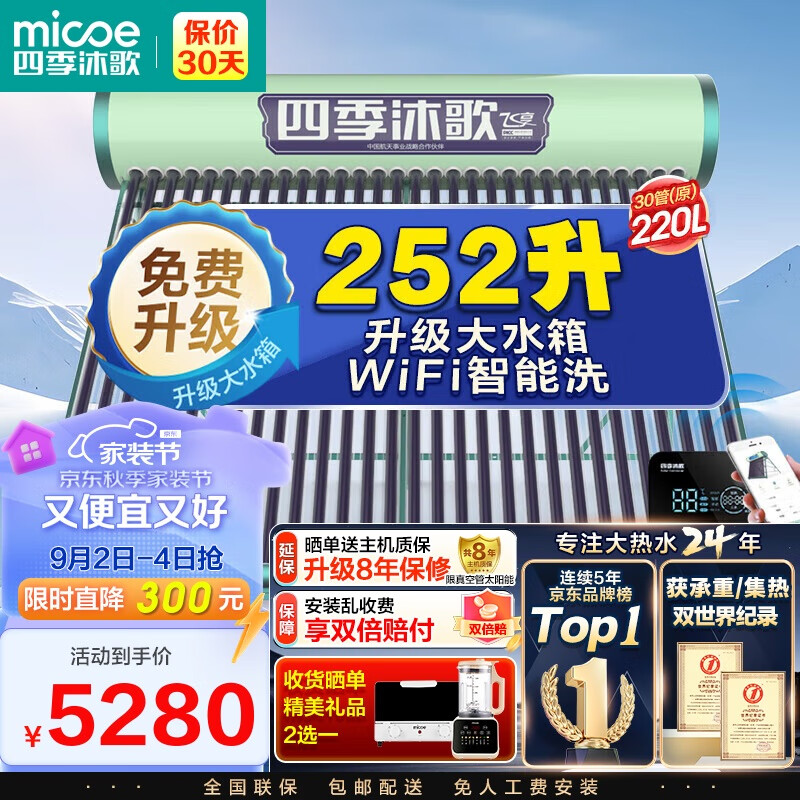 四季沐歌(MICOE)飞享WIFI智控太阳能热水器 家用光电两用 自动上水 带电加热 WiFi远程智控 30管220L送货+安装价格:5580.00元!