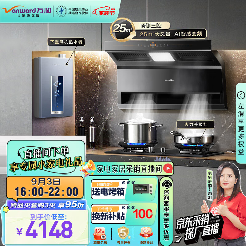 万和(Vanward)烟灶热全家桶 三腔7字型大吸力1000Pa变频油烟机燃气灶具下置风机热水器 WL860+C5L90S+V5D16价格:4098.00元!
