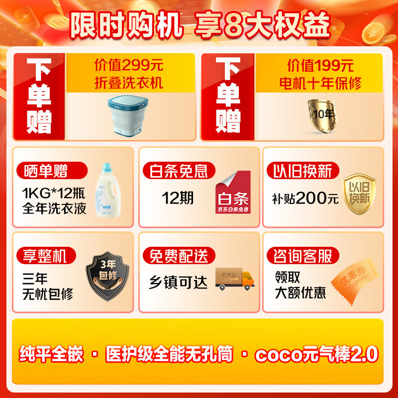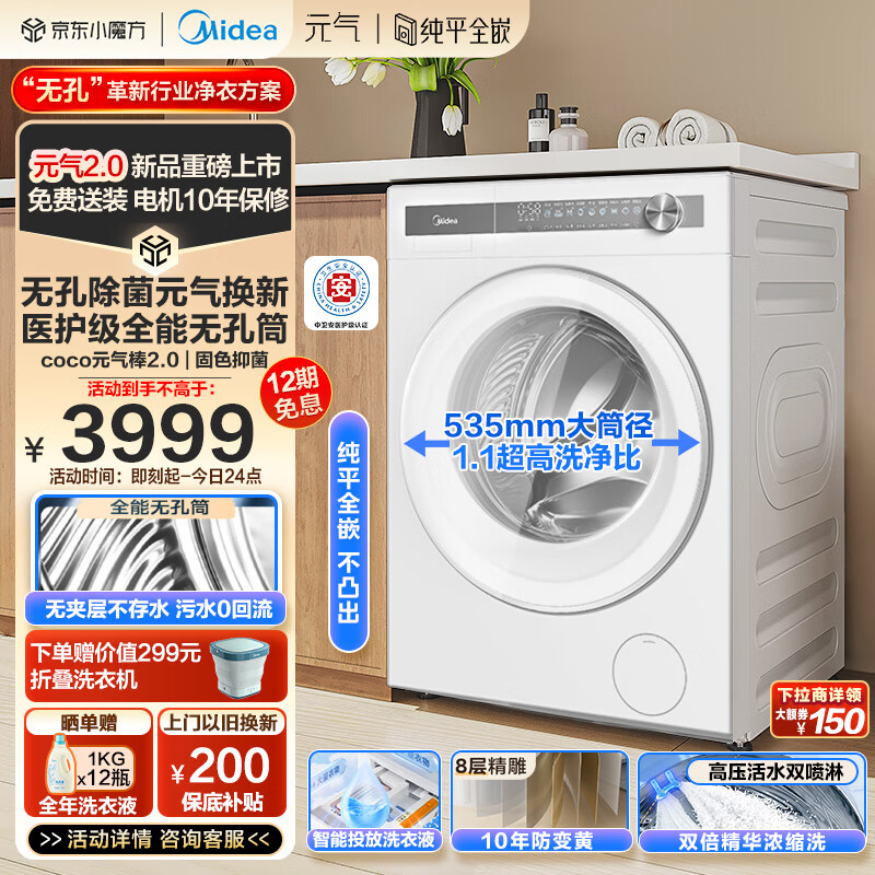 美的(Midea)滚筒洗衣机全自动家用 MG10L7PRO 10公斤 纯平全嵌 元气2.0 COCO元气棒 白色防变黄 医护级除菌螨价格:3999.00元!
