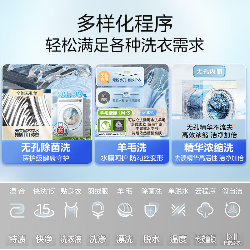 1、洗衣机非常的漂亮,各种洗涤模式非常的多,洗衣机桶内还有灯光照明,方便拿拿取衣物,洗衣机运行起来非常的平顺,很安静,噪音很小,洗衣机的洗涤容量也各大,一次可以洗很多衣服,床单被罩等大件也可以轻松放进去洗。