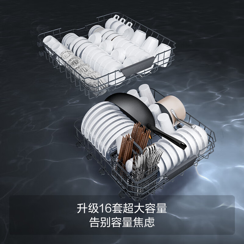 3、本以为16套很大,结果用起来发现,我们家5个人,还是要那么大才够。放口锅就占了很多空间。洗得挺干净,但锅铲上的粘住的东西没有洗干净。然后烘干也不是那么干。总体满意,解放手洗碗。