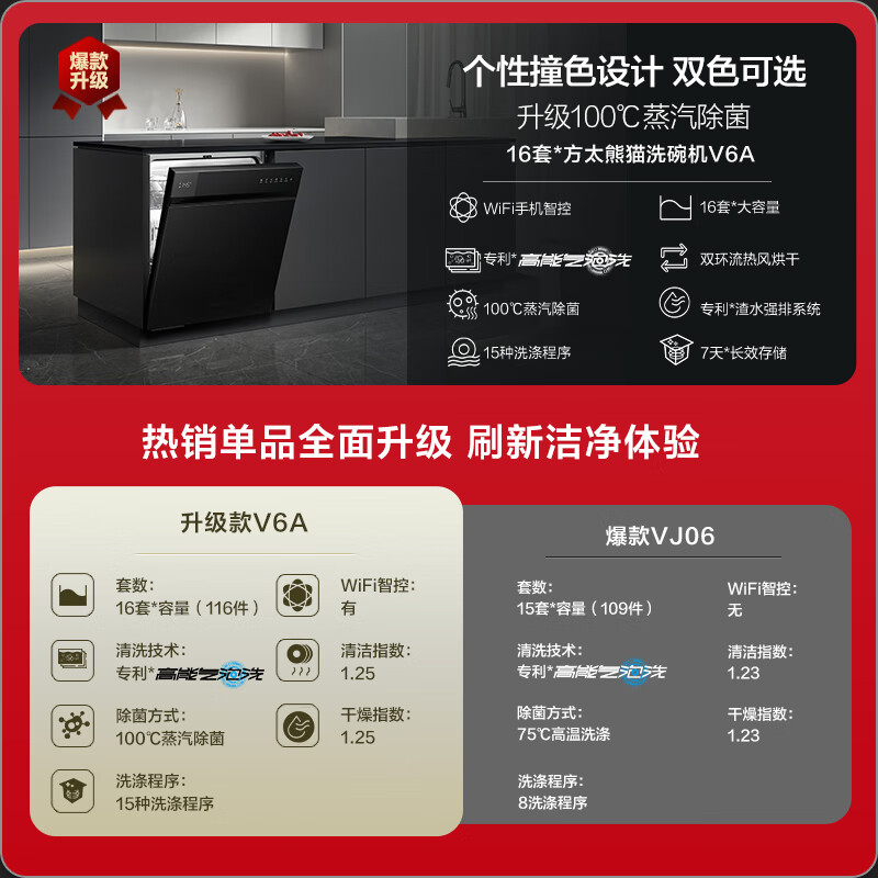 方太熊猫洗碗机V6系列嵌入式家用 16套超大容量V6 Pro版 100℃蒸汽除菌 个性撞色设计 02-V6A价格:5599.00元!